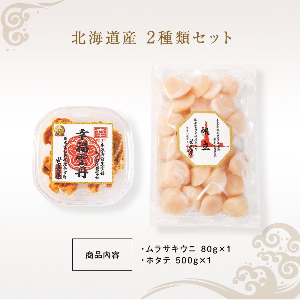 | 内容量 | ムラサキウニ 80g×1、ホタテ 500g(4s)×1 |